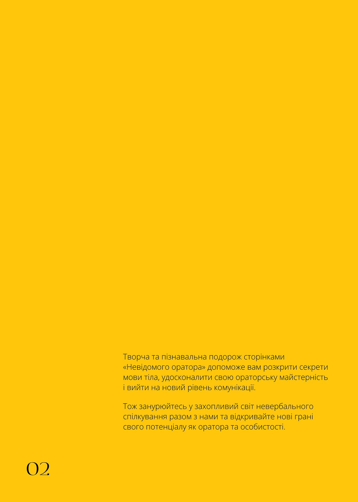 Це перший випуск унікального науково-популярного журналу «Невідомий оратор», присвяченого ораторському мистецтву та невербальній комунікації. Автор ідеї, засновник і головний редактор видання – Микола Овчаров, фахівець з ораторської майстерності, який прагне поділитися своїми знаннями та досвідом з широкою аудиторією.